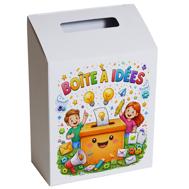 Apportez une touche ludique et participative à votre école ou association avec cette boîte à idées en carton au design soigné. Idéale pour recueillir des suggestions, avis ou messages de manière simple et accessible, elle invite naturellement à l’expression — même anonyme.